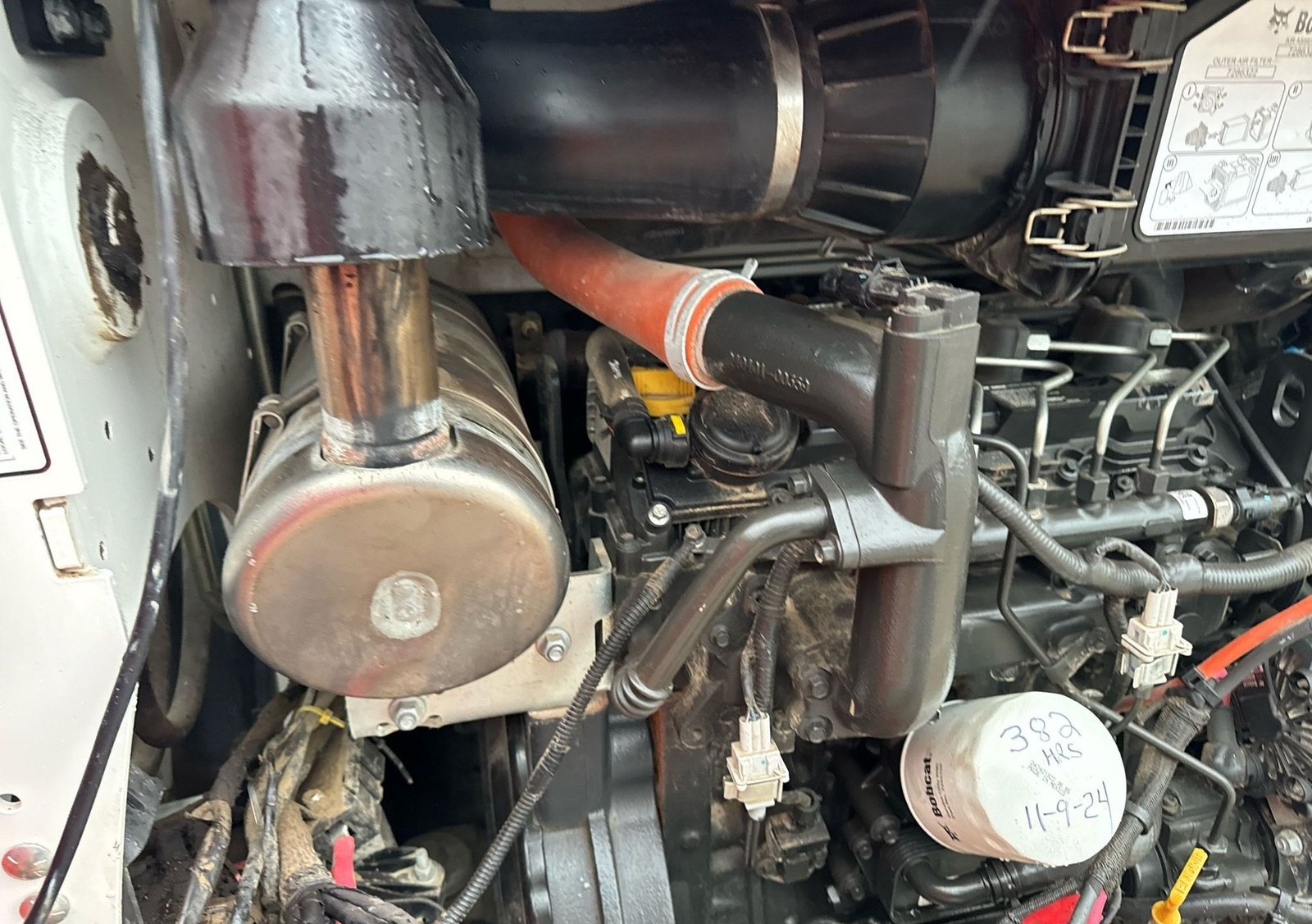 Shows 382 hours. Powered by a Bobcat 4-cylinder diesel engine with hydrostatic transmission and two-speed travel for smooth, responsive operation.